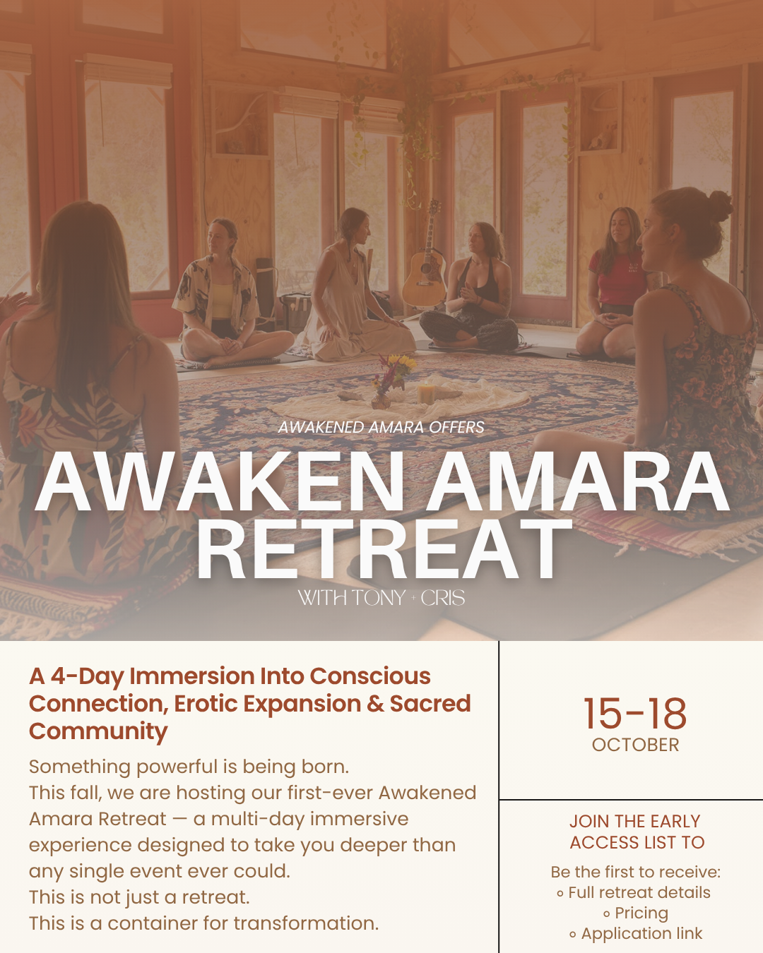 AWAKEN AMARA RETREAT | OCTOBER Thursday, October 15, 2026 6:30 PM Sunday, October 18, 2026 7:30 PM Austin, Texas (map) Google Calendar ICS Learn more Here Learn more Here